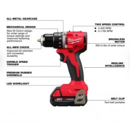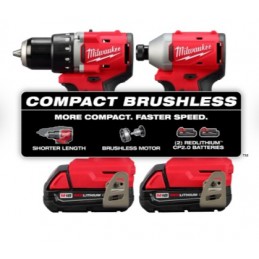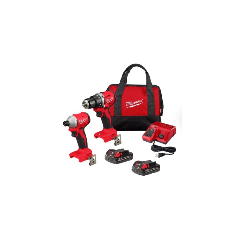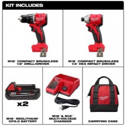 Incluye el taladro percutor M18™ compacto sin escobillas de ½«, el destornillador de impacto hexagonal M18™ compacto sin escobillas de ¼”, (2) paquetes de baterías M18™ REDLITHIUM™ CP2.0, cargador multivoltaje M18™/M12™ y bolsa para contratistas.