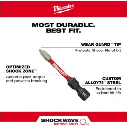 El juego de brocas para destornillador SHOCKWAVE™ Impact Duty™ de 54 piezas de MILWAUKEE® está diseñado para ser las brocas de destornillador más duraderas y de mejor ajuste en el mercado. WEAR GUARD TIP™ proporciona una mayor resistencia al desgaste, lo que protege el ajuste de la broca de impacto durante toda la vida útil de la broca. SHOCKZONE™ está optimizado para cada tipo de punta y longitud de punta para destornillador del juego, con el fin de absorber el torque máximo y evitar las roturas. Las brocas para destornillador poseen acero ALLOY76™ PERSONALIZADO para lograr un diseño a medida del acero y cuentan con un tratamiento térmico por tipo de broca, con el fin de prolongar la vida útil de las brocas para destornillador del usuario, lo cual permite una vida útil hasta 50 veces mayor que otras brocas para destornillador de impacto del mercado. Las brocas para destornillador SHOCKWAVE Impact Duty™ de Milwaukee® están hechas para proporcionar a los usuarios una durabilidad extrema para las aplicaciones más exigentes. El juego se organiza en un estuche de accesorios personalizable diseñado para su uso en PACKOUT™.