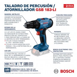 El potente y versátil GSB 183-LI de Bosch permite introducir tornillos de hasta 3/8” de diámetro en madera y perforar hasta un diámetro de 35 mm en madera y hasta 10 mm en mampostería y metal.